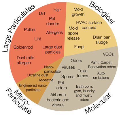 Air contamination is varied—from chemical to biological to particulate—and in a very large range of sizes, molecular to visible.